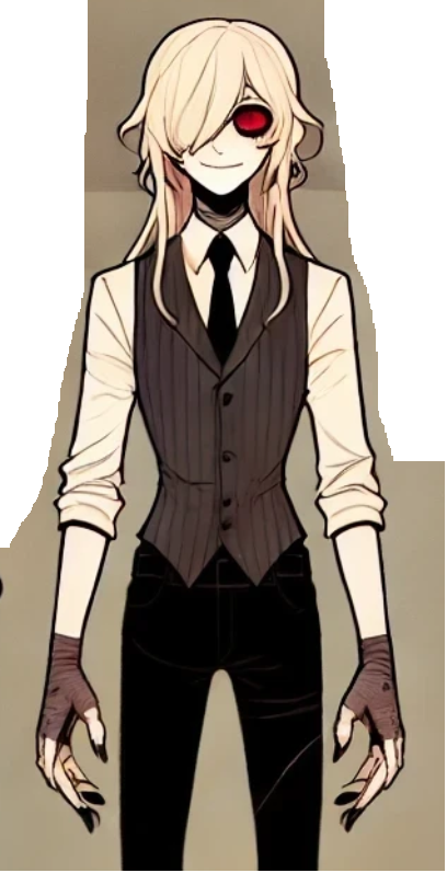 Elise’s presence is striking yet subtly unsettling, pale skin is pale. Her snake-like red eyes are her only common perceivable feature, with slitted pupils and a gleaming,