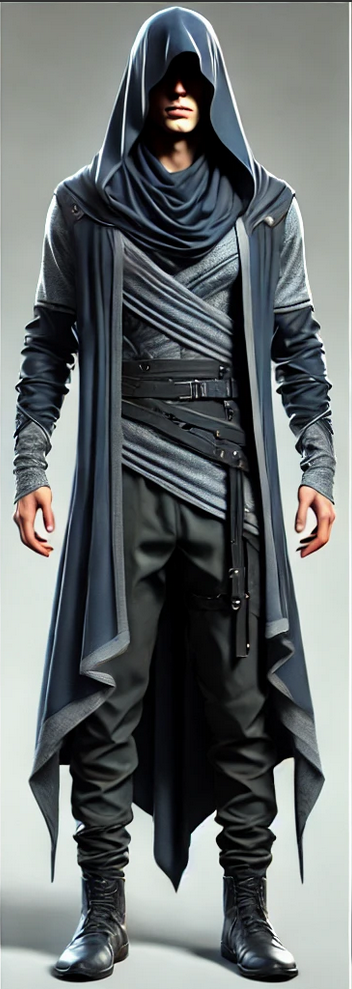 His attire is lightweight cloak and fitted clothing, in shades of blue, silver.