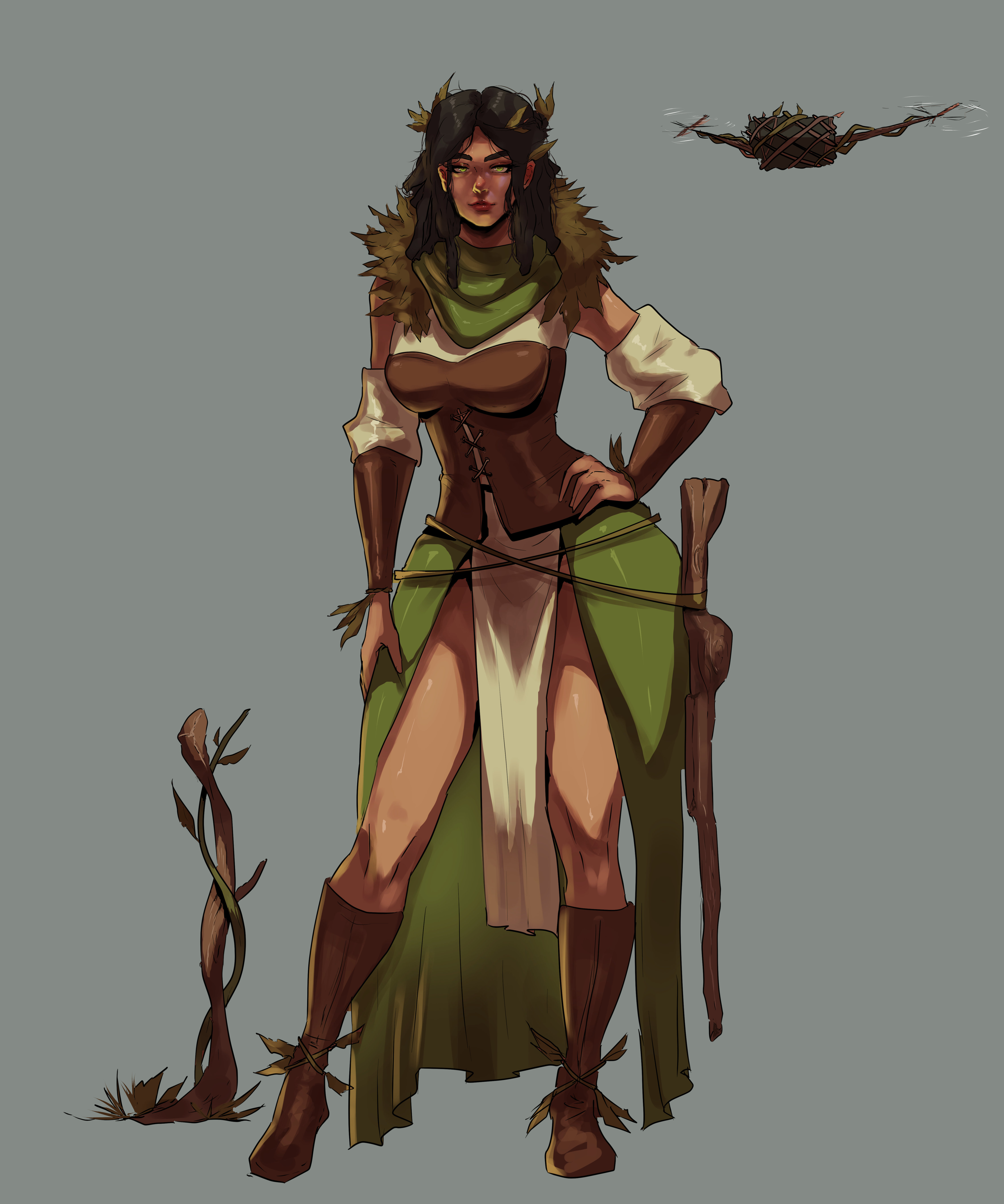 Kaelen is a skilled fighter and adept in various forms of combat. She specializes in a unique blend of traditional tribal fighting techniques and magical abilities. Her affinity for nature allows her to harness the power of the wild, using elemental magic to manipulate plants, bones, and the environment to her advantage. Usually carrying seamless branches and seeds that she manipulates shaping them to use as modern weapons, like guns, armor, shields, and even drones, giving plants a mechanic like appearance though they are undistinguishably made of wood and more fragile than a metallic counterpart. She is able to manipulate partially things made form plants or animals without any extra processing giving her the abilities to use or manipulates certain objects, like re-weaving clothes or make a rope tie itself.